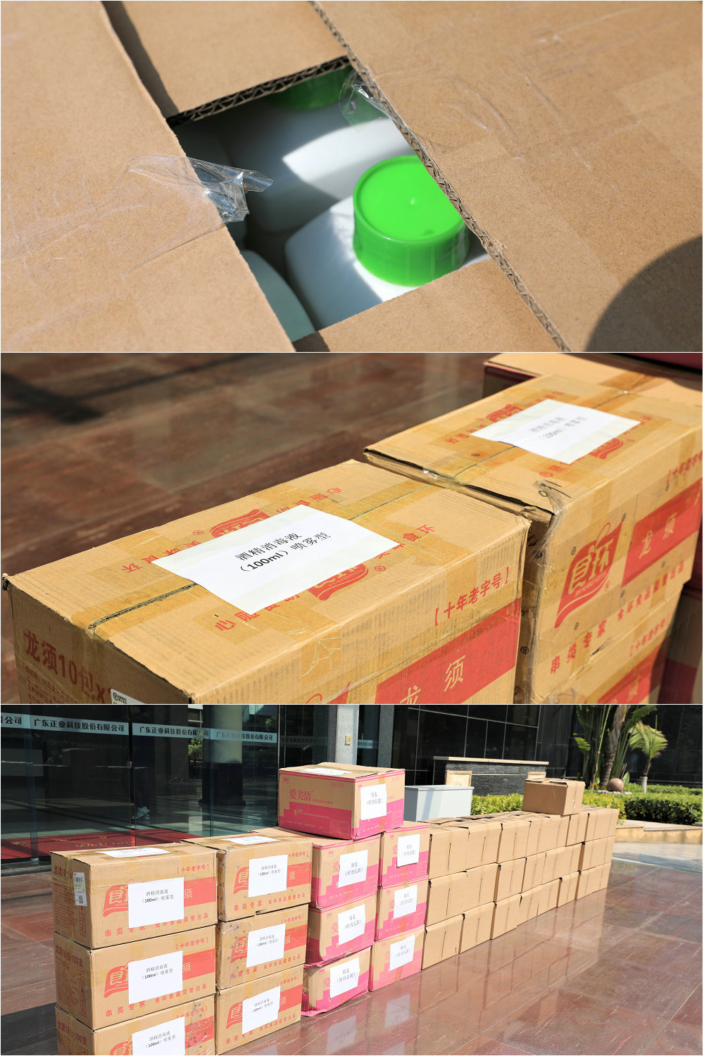 本次捐赠的物资包含960瓶的100ml酒精消毒液、500瓶的1升次氯酸消毒液(巴氏消毒液)以及200件防护雨衣。
