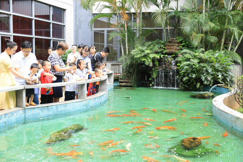 黄的、白的、黑的鱼儿在水里游来游去,时不时悄悄冒出水面吐一个梦幻般的空气泡…..在参观公司时,小朋友们来到了鱼池边,看到鱼儿可兴奋极了,并在爸爸妈妈的指导下给鱼儿投食。