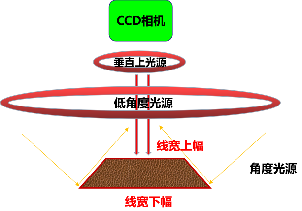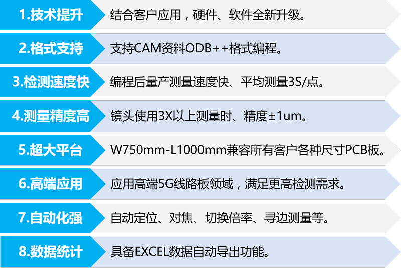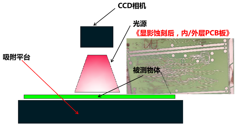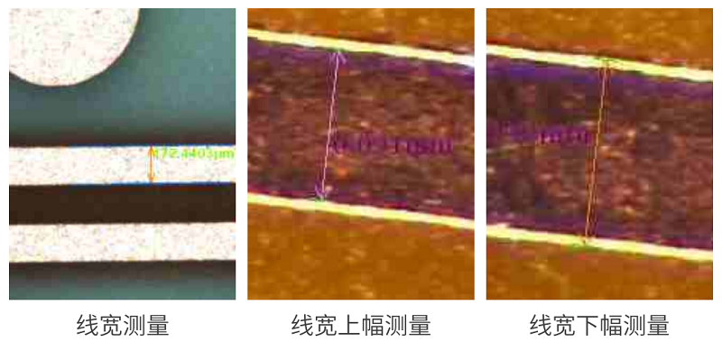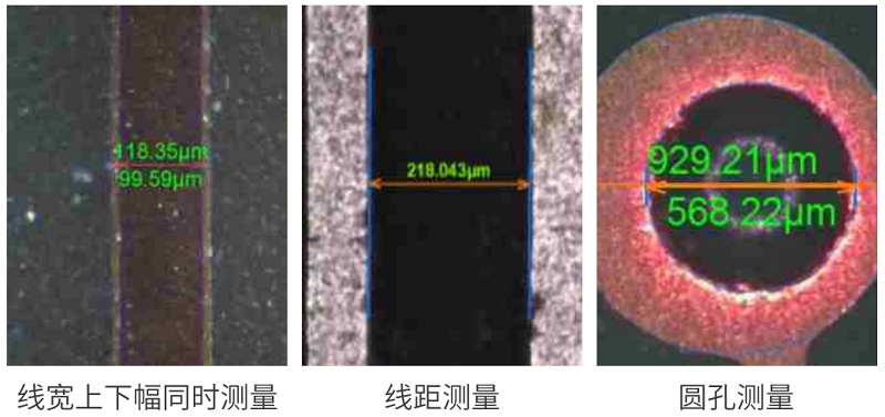 通过影像成像系统及光源从上表面垂直于被测板,呈显影像(相机实时拍图)感测,并将图像传送至电脑测量软件,通过软件测量工具分析图像的“线宽/线距/线宽上下幅//金手指线宽等”标准公差值对比,从而判断被测板上的测量值OKNG。