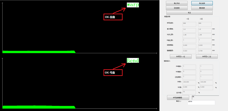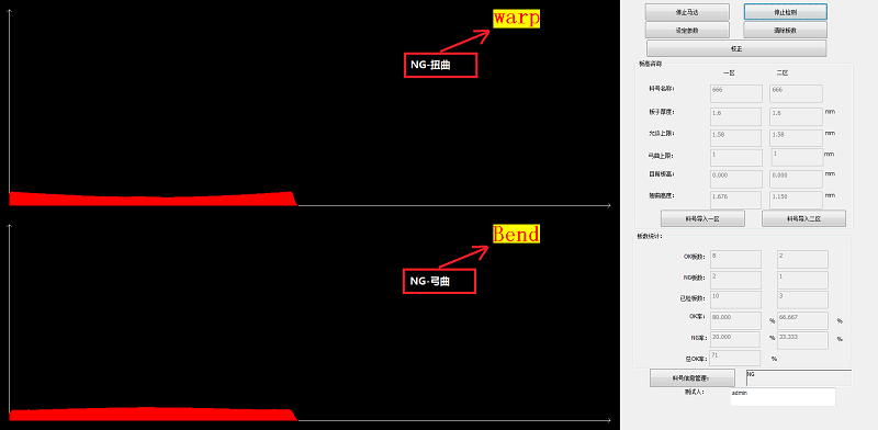 通过位置的信息可以得到亚洲无码麻豆视频板的板厚曲线图,通过特定软件算法和翘曲度定义,计算出板翘曲度,并根据设定判断条件得出OK和NG板。