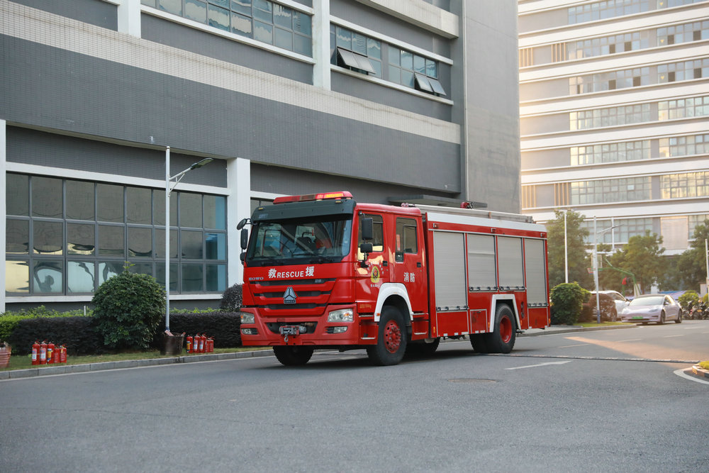 松山湖消防大队接到模拟报警后,迅速到达现场,在确认起火地点后,立即连接水带、启动灭火设备;灭火组、搜救组等小组各司其职,有序开展灭火救援行动。