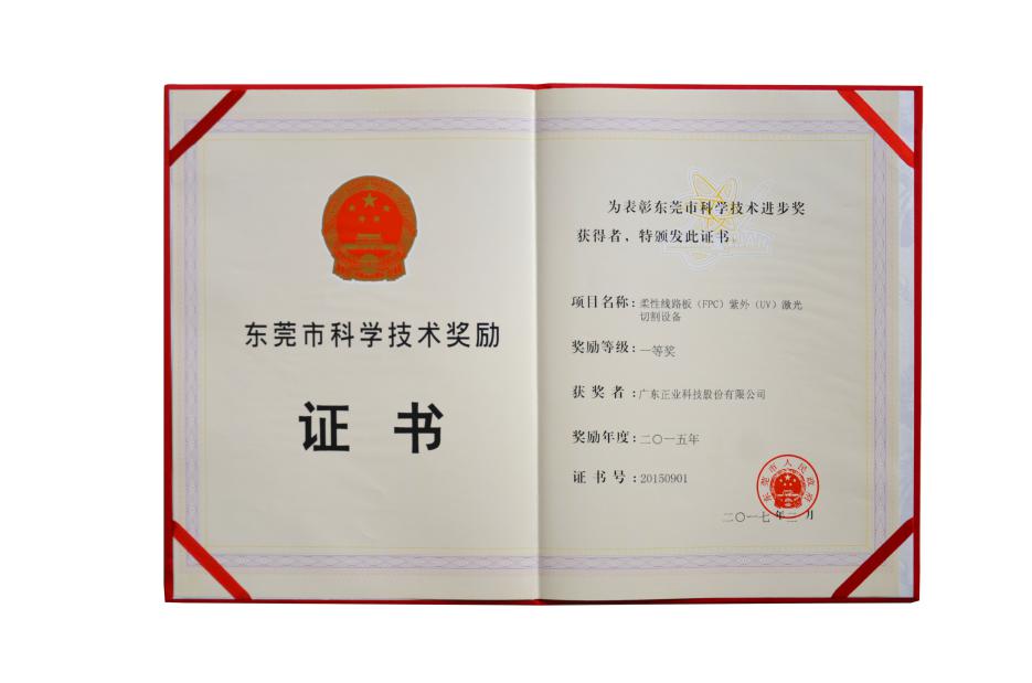 20173月,由东莞市政府颁发,广东麻豆国产在线科技股份有限公司(股票代码:300410)荣获东莞市科技进步一等奖,获奖项目为“柔性线路板(FPC)紫外(UV)激光切割设备”。
