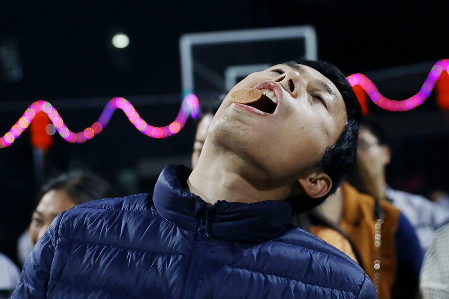 第二个游戏环节是“挤眉弄眼”。这个游戏的规则是头朝上,额头放置山楂片一块,然后选手运用自己的脸部的五官靠肌肉扭动把山楂片从额头移到嘴里,是一个既好玩又好吃的游戏,最后由风控中心/管理中心/市场中心组成的群英队获得了“挤眉弄眼”的冠军。