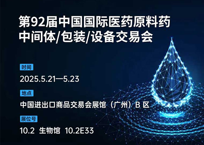 第92届中国国际医药原料药/中间体/包装/设备交易会 时间:2025.5.21-5.23 地点:中国进出口商品交易会展馆:(广州)B区 展位号:10.2 生物馆 10.2E33
